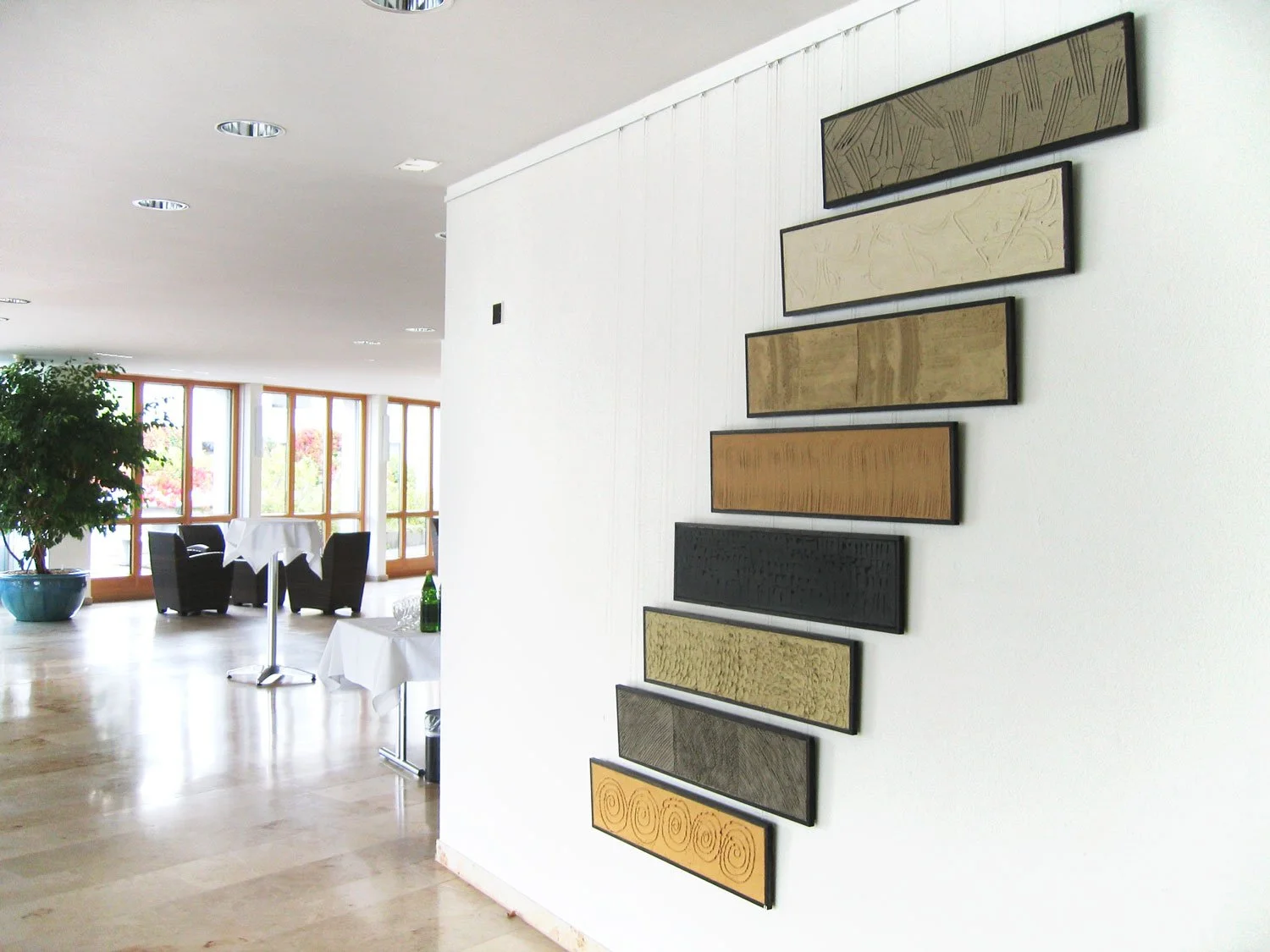 Pigmente und Tonerde werden entsprechend ausgesucht, dass sie sich zu einem gemeinsamen Ganzen fügen. Format und Anzahl werden auf die räumlichen Bedürfnisse abgestimmt.